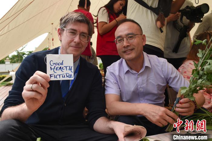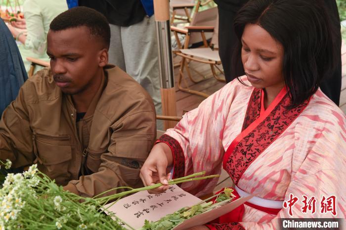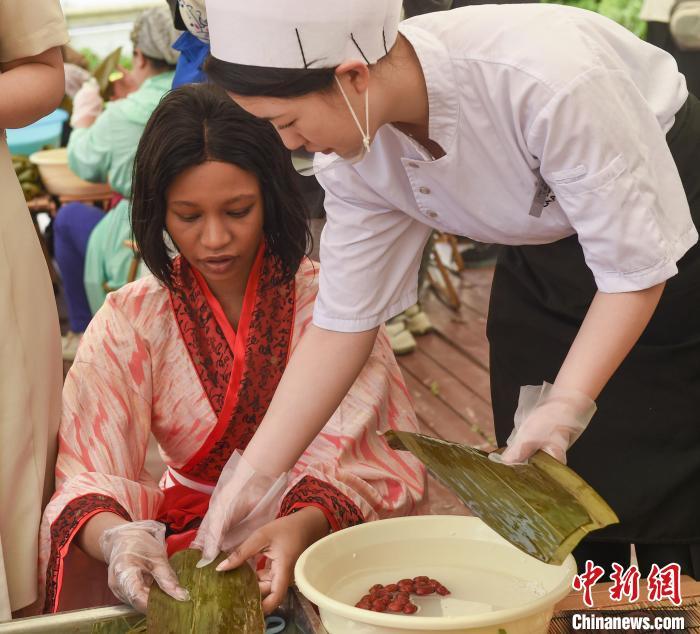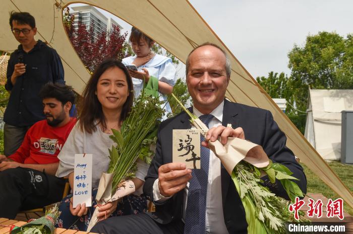 6月7日,山东烟台高新区,来自加拿大、美国、德国、巴基斯坦、俄罗斯等国家的外国友人参与迎接端午节民俗活动。他们包粽子、制作艾草花束、编五彩绳,沉浸式感受端午“味道”。曲正扬 摄